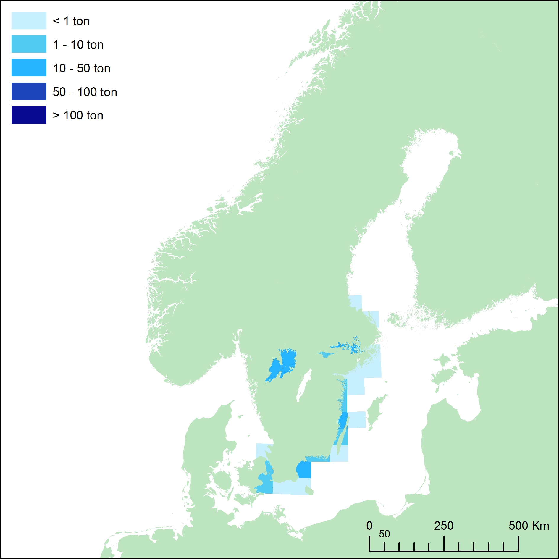 Svenska yrkesfiskares huvudsakliga landningar (ton) av Ål 2023 per Ices-rektangel och de stora sjöarna. En Ices-rektangel är cirka 56 km x 56 km stor.