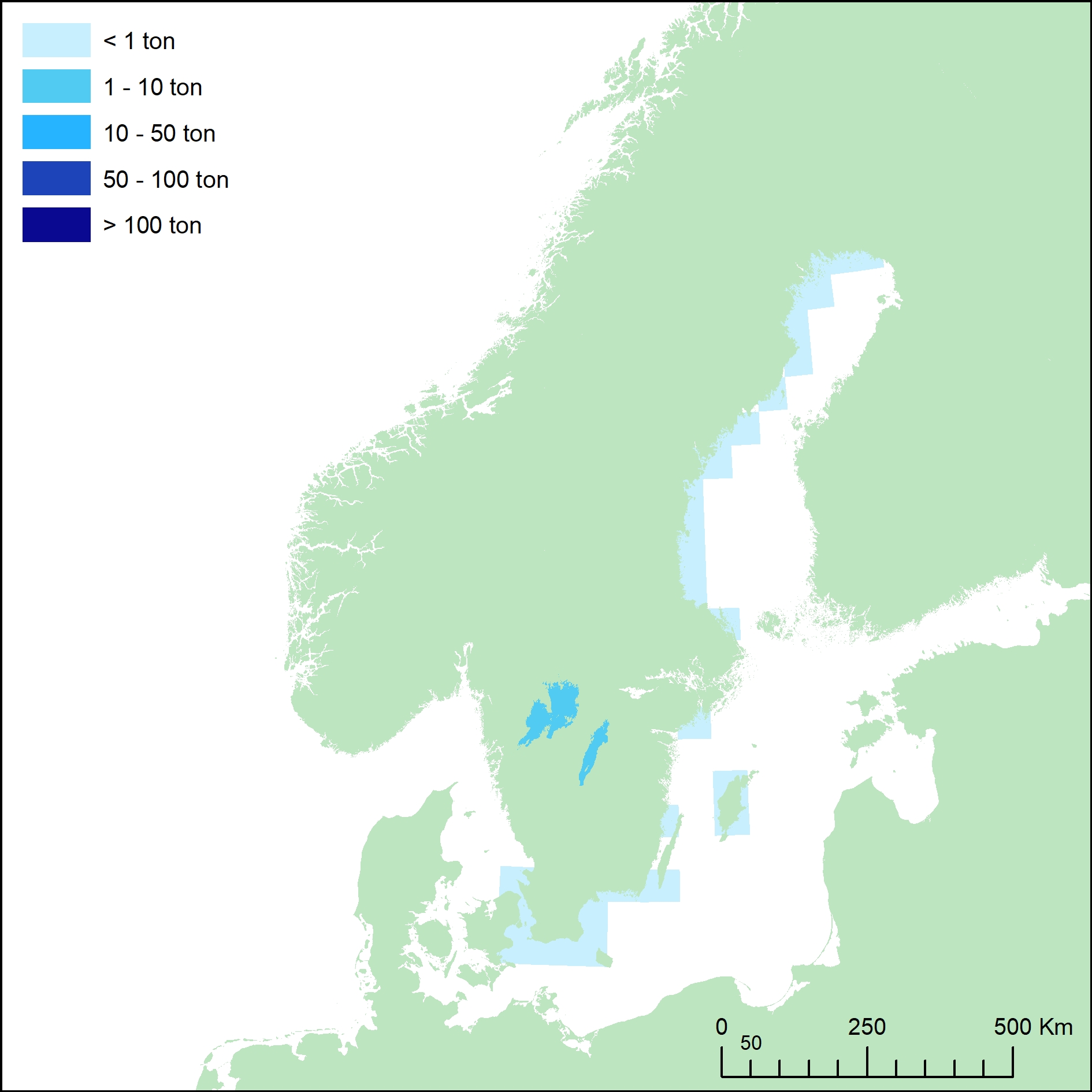 Svenska yrkesfiskares huvudsakliga landningar (ton) av öring 2023 per Ices-rektangel och de stora sjöarna. En Ices-rektangel är cirka 56 km x 56 km stor.