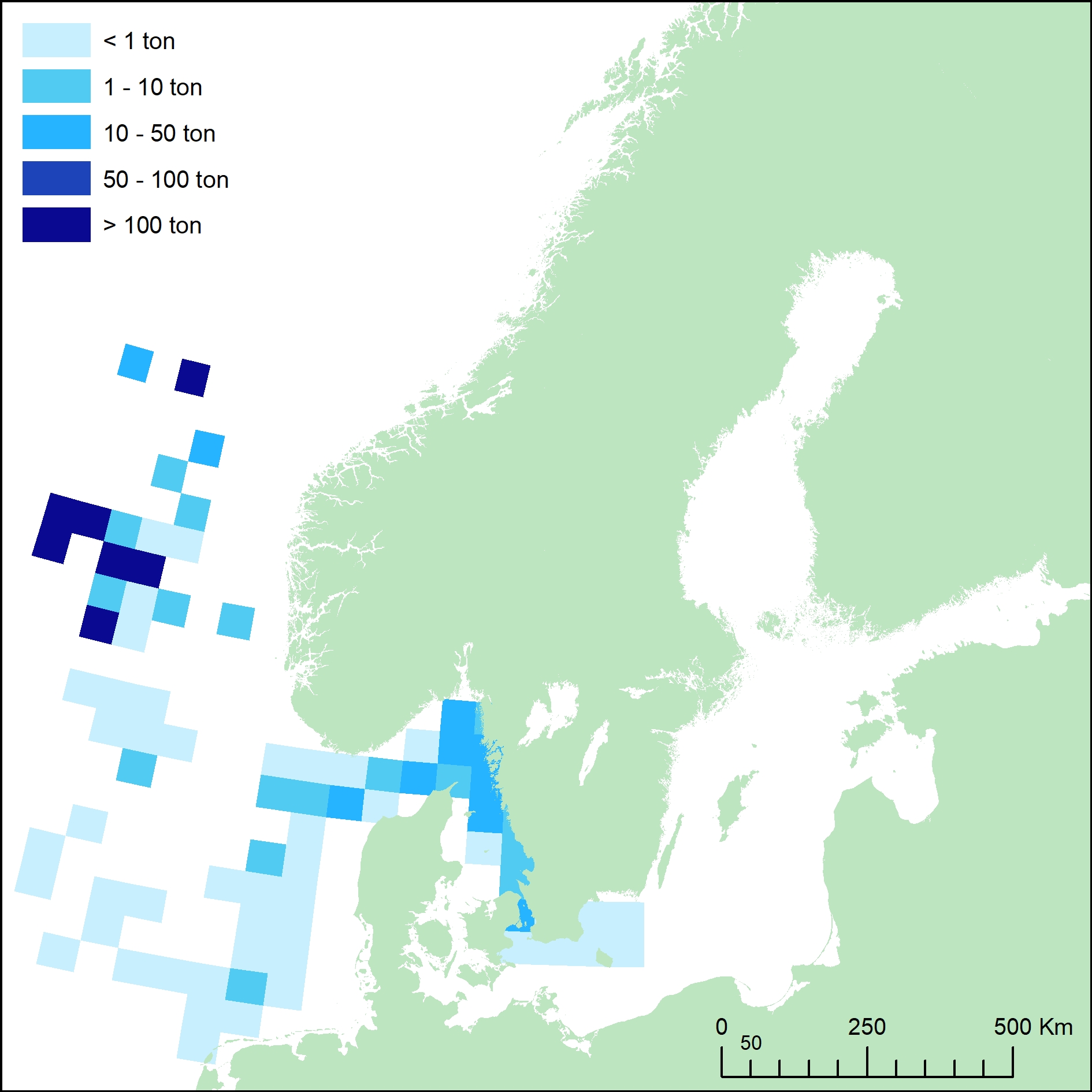 Svenska yrkesfiskares huvudsakliga landningar (ton) av makrill 2023 per Ices-rektangel. En Ices-rektangel är cirka 56 km x 56 km stor.